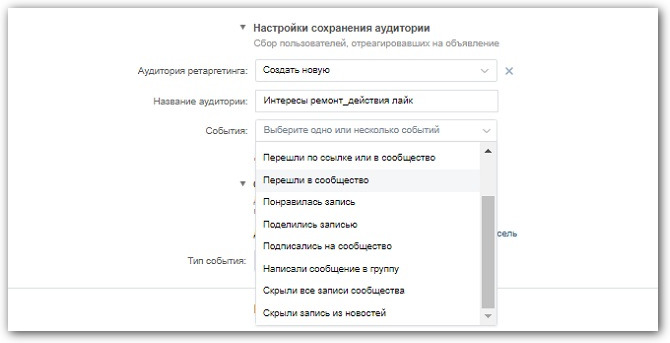 Также можно создавать группы пользователей для ретаргетинга, которые будут собираться на основе взаимодействий с вашей рекламой во ВКонтакте. В настройке сохранения аудитории выберите «Создать новую», дайте ей название и отметьте действия, которые должен совершить пользователь, чтобы попасть в вашу группу: